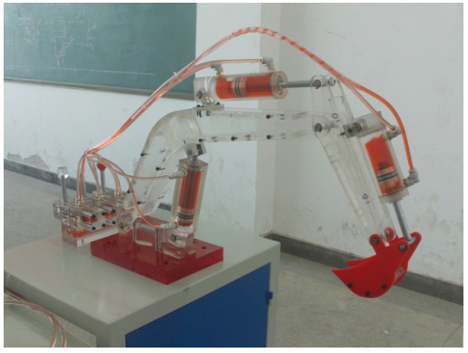 實訓(xùn)臺主要由底柜,透明大臂,透明斗桿,透明挖斗(紅色),透明油缸,透明集成閥島,透明手動換向閥,透明電磁閥,旋缸馬達(dá),減速器等成